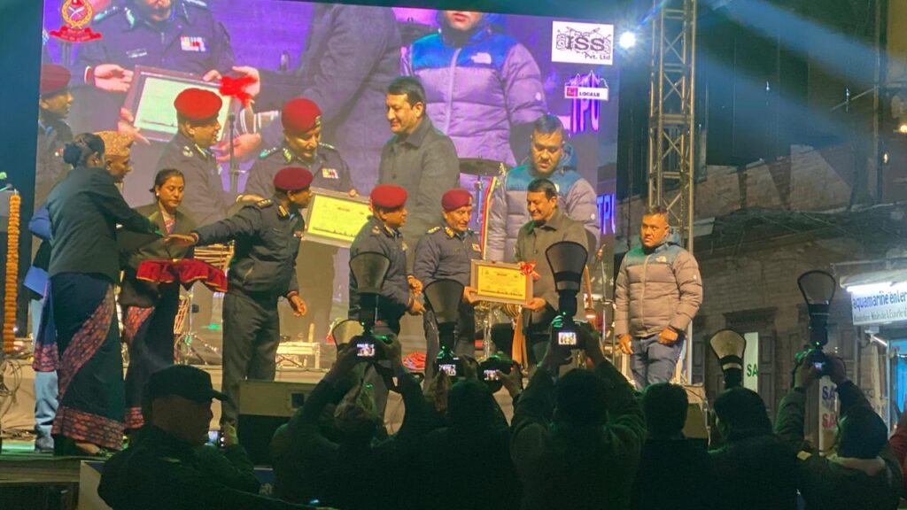 काठमाडौँ : जिल्ला प्रहरी परिसर काठमाडौँले गोकर्णेश्वर नगरपालिकालाई विशेष योगदान गरेको भन्दै कदरस्वरूप सम्मान गरेको छ। “हाम्रो प्रहरी” अभियान शुभारम्भको अवसरमा वसन्तपुरमा आयोजित विशेष समारोहमा प्रहरी महानिरीक्षक दानबहादुर कार्कीले गोकर्णेश्वर नगरपालिका प्रमुख दीपक रिसाललाई सम्मानपत्र हस्तान्तरण गर्दै सम्मान गर्नुभएको हो।